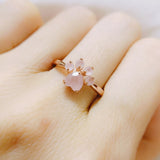 This ring was inspired by the pink paw pads of a kitten. Made with Real Rose Quartz Crystal handpicked and imported from Madagascar. The Vibrant polished pink crystal is one of a kind. The Rose Quartz meaning is that of universal love. The crystal is said to possess healing properties, and have a strong divine connection to the animal species. Have Rose Quartz connected with your skin by wearing it on your finger.